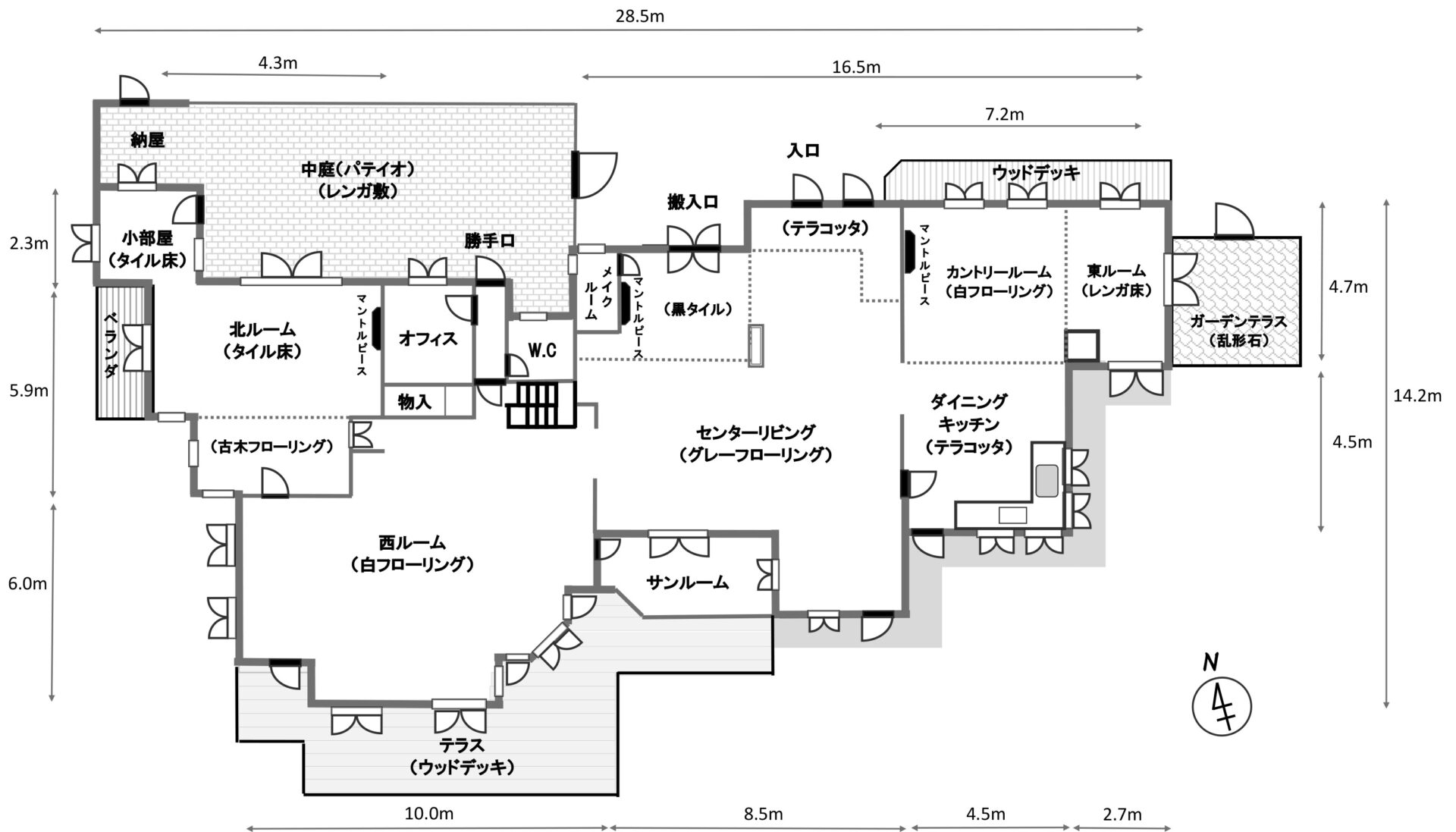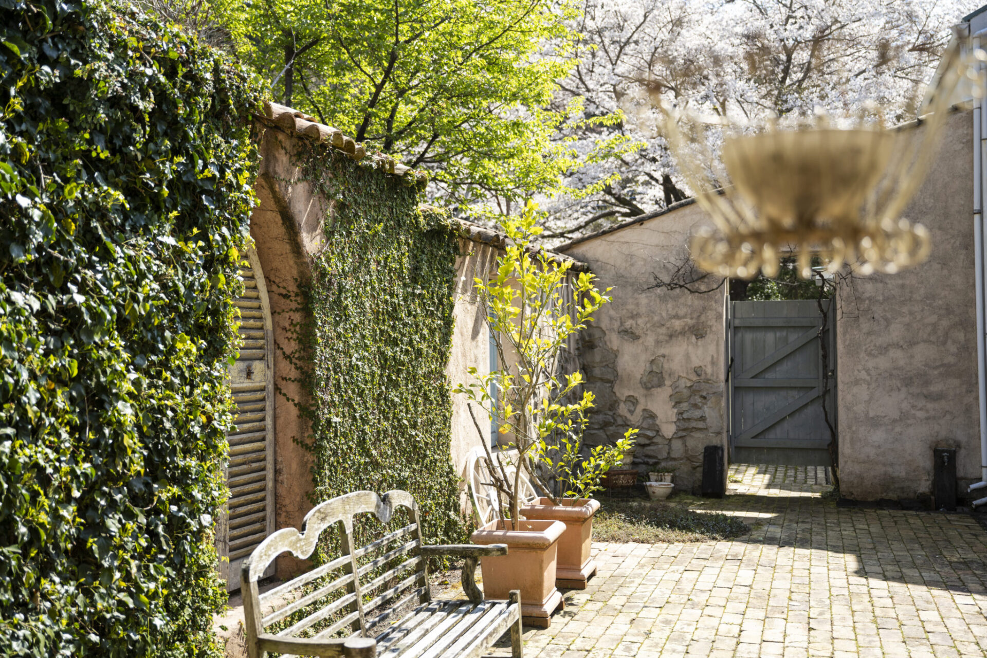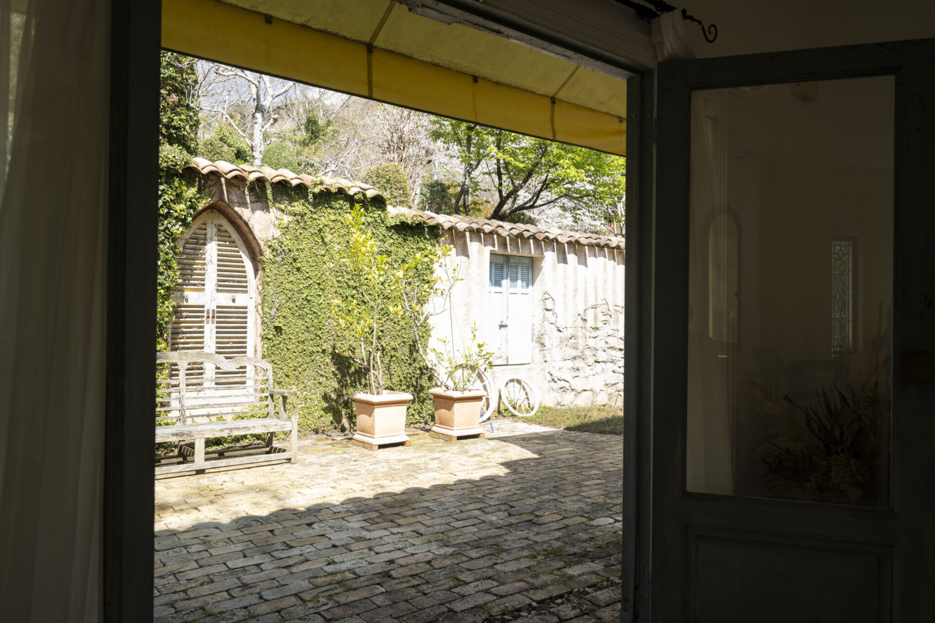 石畳のガーデンテラスやアンティークなドアがアクセントとなり、まるでヨーロッパの郊外に佇む邸宅のような雰囲気を醸し出します。